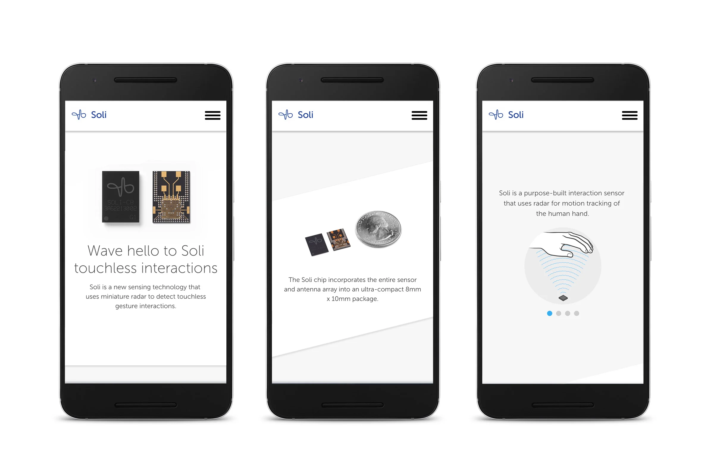 The Challenge: How do we explain a completely new interaction paradigm in a mobile-first design approach? Web video, with it's need to do a full-screen takeover, was out of the question on even the most advanced mobile browsers at the time. Ironically, it was in revisiting the "older" technology of GIF's that we were best able to show quickly and easily what Soli could do without requiring users to be locked into one video at a time.